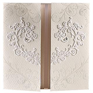 Zaproszenie ślubne w postaci tryptyku wykonane z białego, fakturowanego papieru zdobione motywem filigranowego serca oraz diamencikami Swarovskiego. Zaproszenie stanowi idealne połączenie druku jedwabnego oraz wyrafinowanego zdobienia perłową folią.