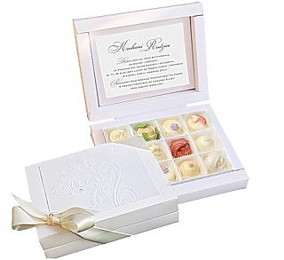 Pudełko przeznaczone jest na pralinki z naszej oferty, których koszt w zależności od wyboru klienta wynosi od 0,50 zł/szt. do 3,90 zł/szt. lub pralinki ręcznie robione W zależności od potrzeb można w nim umieścić inne podarunki: pieniądze, kupon lotto, kartkę z życzeniami lub podziękowaniami dla rodziców.