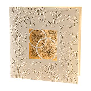Zaproszenie z prostym wycięciem dwóch splecionych obrączek pośrodku okładki, widać przez nie złoty papier wklejki z misternym kwiatowym motywem. Geometryczność rysunku obrączek pokreślona została przez bogate, stylizowane tłoczenie dookoła wycięcia.